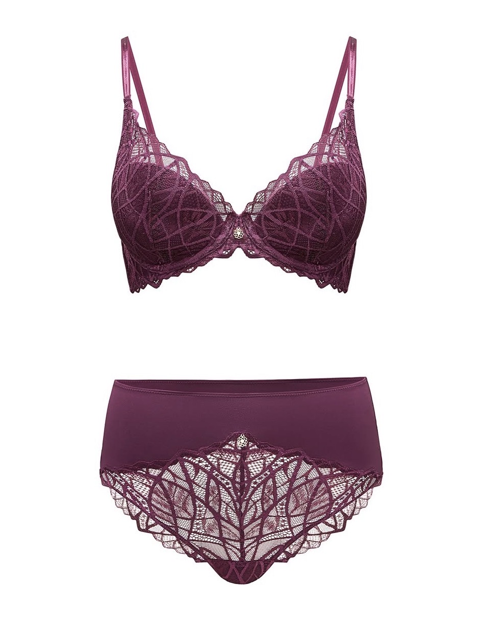 Biustonosz, którego miseczki osadzone na fiszbinach wykonane są z delikatnej pianki gorseciarskiej połączonej jednym pionowym szwem. Boczna część miseczki posiada dodatkowy panel, który powoduje mocne zebranie piersi od strony pachy. Wewnątrz miseczek znajduje się kieszonka na wkładkę push-up wykonaną z profilowanej pianki. Wkłądkę można wyjąć lub zachować, co idealnie sprawdzi się przy asymetrycznym biuście. Pas obwodu wykonany jest z ozdobnej koronki podszytej dodatkową warstwą siateczki. Zewnętrzna część miseczki pokryta została ozdobną, elastczną koronką, która pięknie dopasowuje sie do kobiecych kształtów. Ramiączka są nieodpinane i posiadają płaskie regulatory, które nie odznaczają sie pod ubraniem.