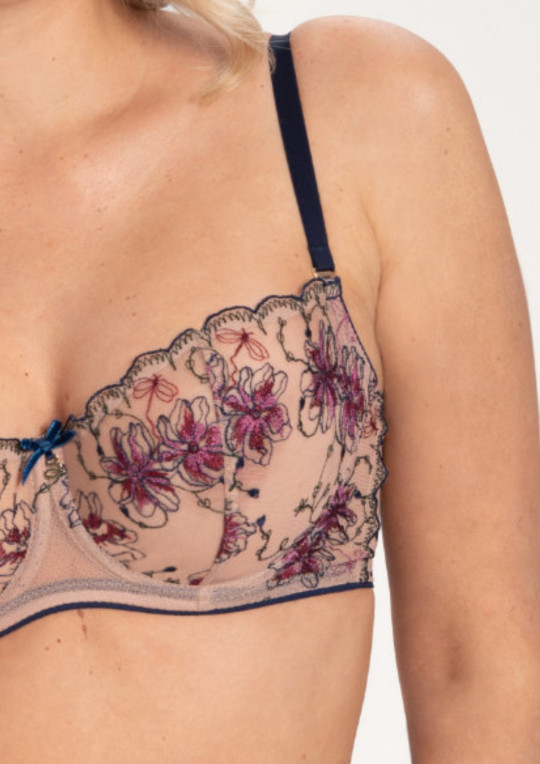 Frida A142 to biustonosz z fiszbinami typu balkon half cup. Frida to propozycja inspirowana lekkością ważek i bogactwem natury. Haft z motywem kwiatów i ważek w szafirowo-wrzosowej palecie tworzy na ciele niezwykły efekt tatuażu. Delikatny tiul i flokowe serduszka dodają bieliźnie uroku. Obwód biustonosza wykonany jest z tiulu o wysokiej gramaturze. Materiał ten jest bardzo lekki, ale zapewnia stabilność i idealne podtrzymanie piersi. Odpinane, regulowane ramiączka pozwolą dopasować biustonosz do sylwetki. Pasuje zarówno pod codzienne ubrania, jak i pod bardziej odważne stylizacje. Frida to lekkość w najbardziej stylowym wydaniu. Ten model jest idealny dla średniego biustu. Materiały, z których wyprodukowano biustonosz posiadają certyfikat Oeko-Tex STANDARD 100®. Wyprodukowano w Polsce.