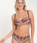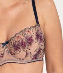 Frida A142 to biustonosz z fiszbinami typu balkon half cup. Frida to propozycja inspirowana lekkością ważek i bogactwem natury. Haft z motywem kwiatów i ważek w szafirowo-wrzosowej palecie tworzy na ciele niezwykły efekt tatuażu. Delikatny tiul i flokowe serduszka dodają bieliźnie uroku. Obwód biustonosza wykonany jest z tiulu o wysokiej gramaturze. Materiał ten jest bardzo lekki, ale zapewnia stabilność i idealne podtrzymanie piersi. Odpinane, regulowane ramiączka pozwolą dopasować biustonosz do sylwetki. Pasuje zarówno pod codzienne ubrania, jak i pod bardziej odważne stylizacje. Frida to lekkość w najbardziej stylowym wydaniu. Ten model jest idealny dla średniego biustu. Materiały, z których wyprodukowano biustonosz posiadają certyfikat Oeko-Tex STANDARD 100®. Wyprodukowano w Polsce.