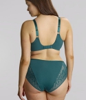 Sophia to miękki biustonosz typu full-cup, stworzony z elastycznej koronki ozdobionej kwiatowo-geometrycznym haftem. Górna część miseczek jest rozciągliwa, co pozwala na idealne dopasowanie do kształtu biustu, subtelnie modelując dekolt i wyrównując drobne różnice w wielkości piersi. Dolne partie miseczek wzmocnione zostały delikatną siateczką, która zwiększa stabilność i podtrzymanie. Komfortowy, dwuwarstwowy pas obwodu z ukrytymi gumkami delikatnie wygładza plecy i zapewnia wygodę noszenia. Przemyślana konstrukcja pasa pomaga również ograniczyć zsuwanie się ramiączek. Całość dopełniają eleganckie, złote detale, które nadają modelowi szykowny wygląd.